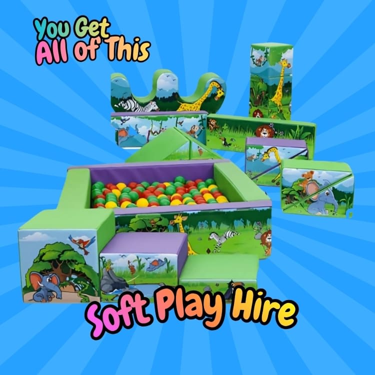 ? Our vibrant, animal-themed soft play packages bring safe, colourful fun to toddlers and younger children, making them perfect for birthdays, baby groups, christenings, playdates, and indoor hall events. With soft shapes, ride-ons, mats, and a matching jungle ball pit, this complete setup creates an immersive mini–adventure zone for little explorers.