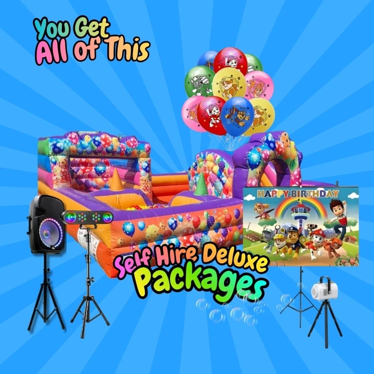 A: Multi-Coloured Inflatable Play Park | Paw Patrol Backdrop | Music Speaker | Disco Light | Paw Patrol Balloons | Bubble Machine | All Included
