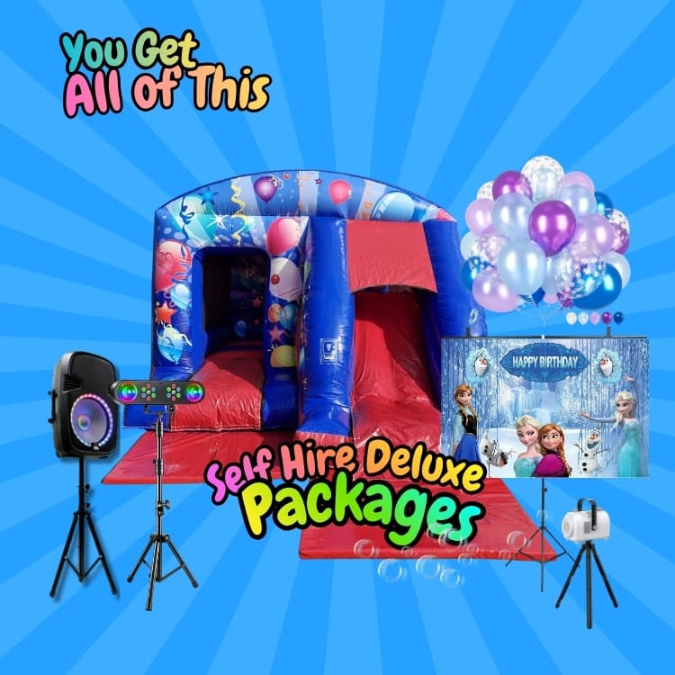Includes: Blue Bouncy Castle with Slide | Frozen Themed Backdrop | Music Speaker | Disco Light | Frozen Balloons | Bubble Machine | All Included