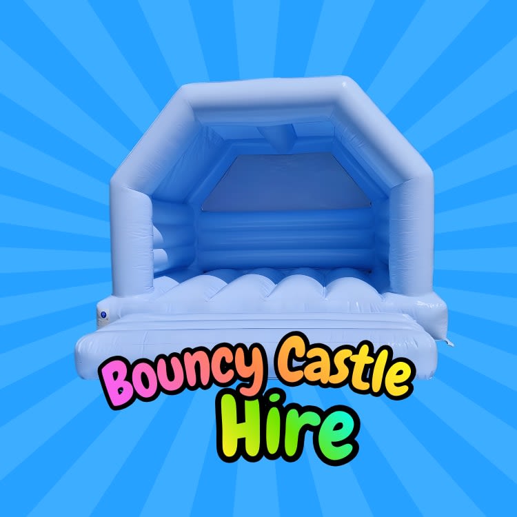 Blue pastel bouncy castle hire for stylish parties, christenings and birthdays. Clean, safe inflatables with delivery and setup included.