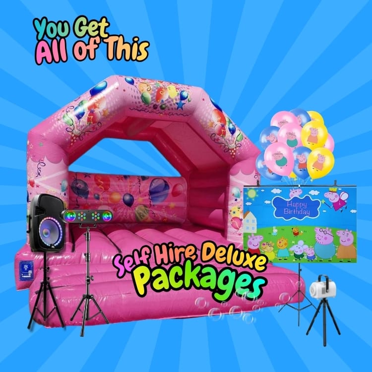A: Pink Bouncy Castle | Peppa Pig Backdrop | Music Speaker | Disco Light | Peppa Pig Balloons | Bubble Machine | All Included