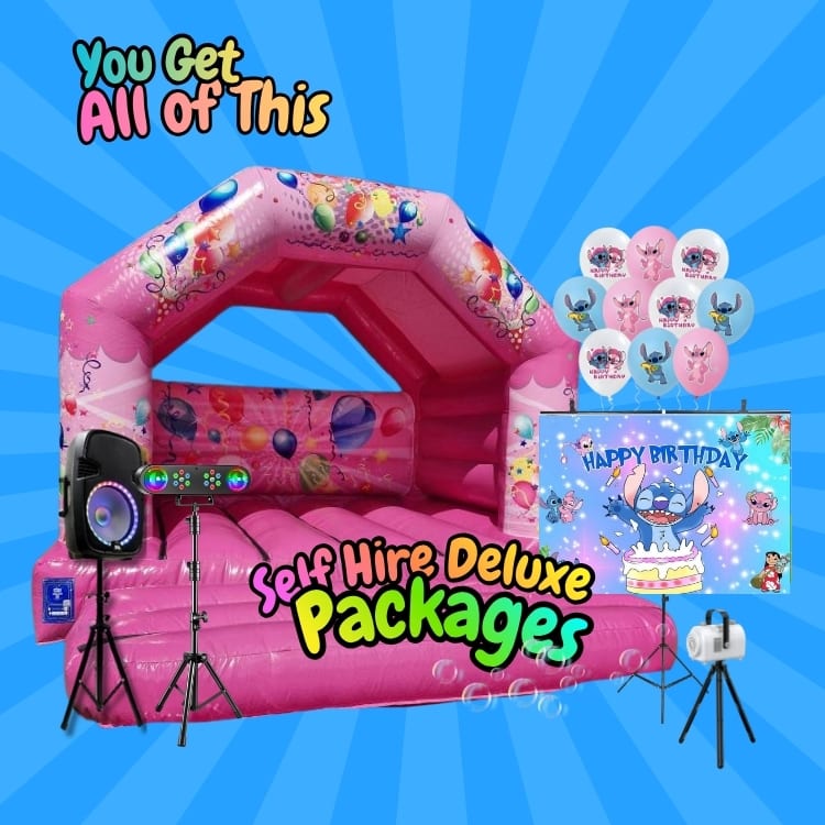 Includes: Pink Bouncy Castle | Lilo & Stitch Backdrop | Music Speaker | Disco Light | Lilo & Stitch Balloons | Bubble Machine | All Included